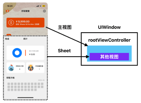 例如,以“存钱猪猪”应用为例,这个应用窗口就是UIWindow,rootViewController根控制器就是底部的主视图。弹出的“统计”Sheet视图就是其他视图。