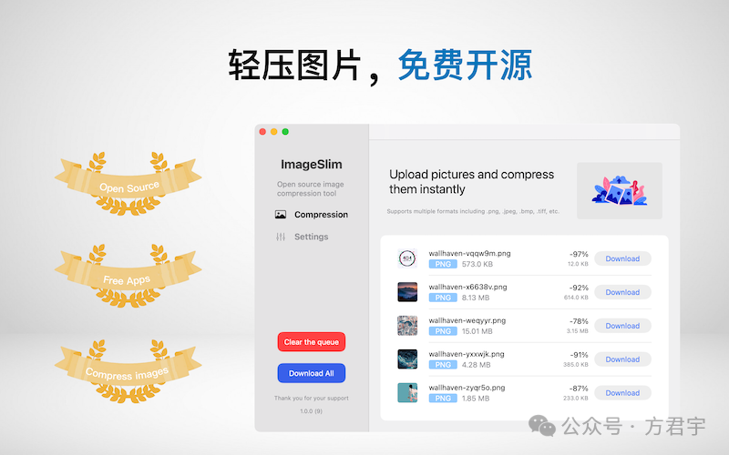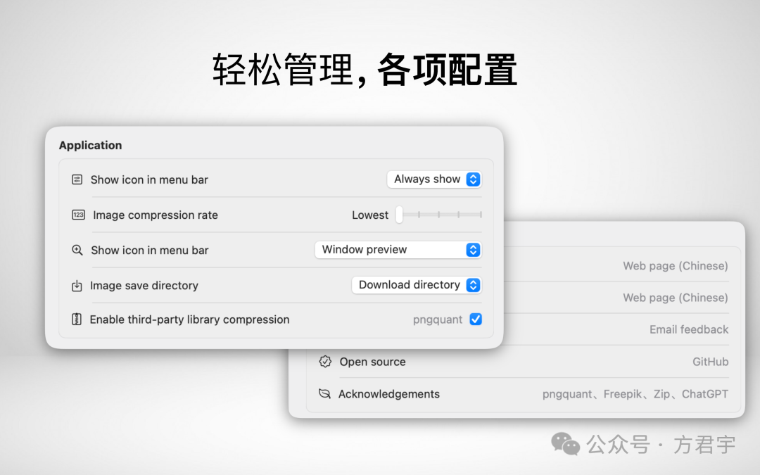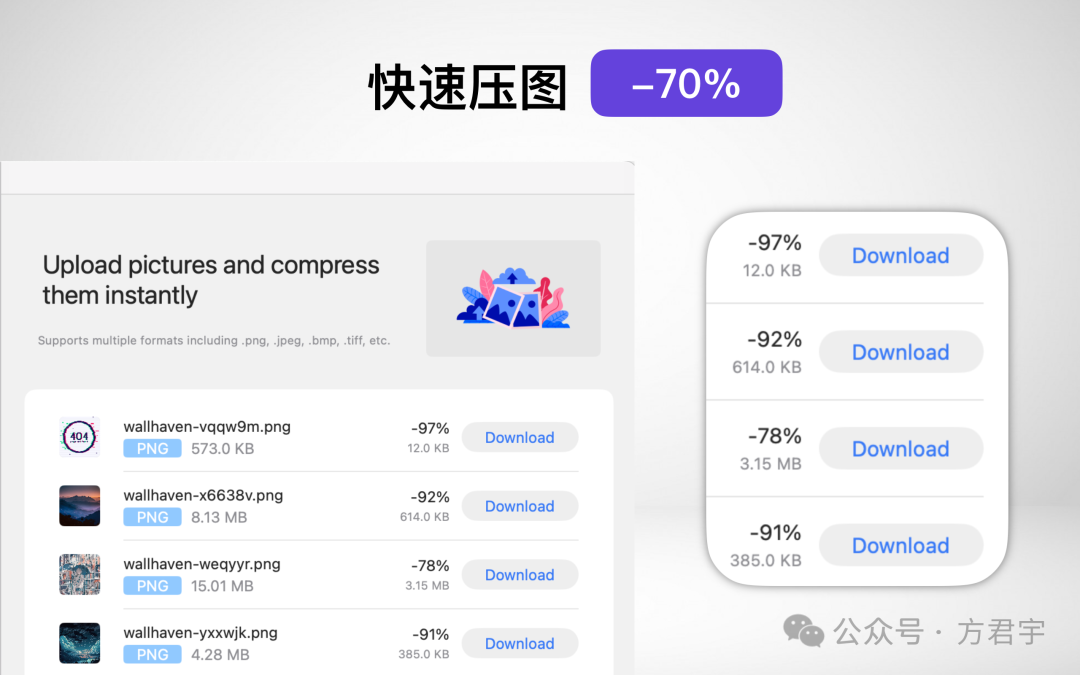 应用内置 macOS 原生压缩功能,同时可选启用第三方开源工具 pngquant、gifsicle进行高效压缩,压缩率最高可达 99%。