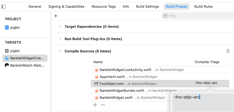 找到报错的文件(例如本次报错的Widget → FooObject.mm文件),双击该行右侧的“Compiler Flags”列。