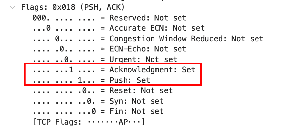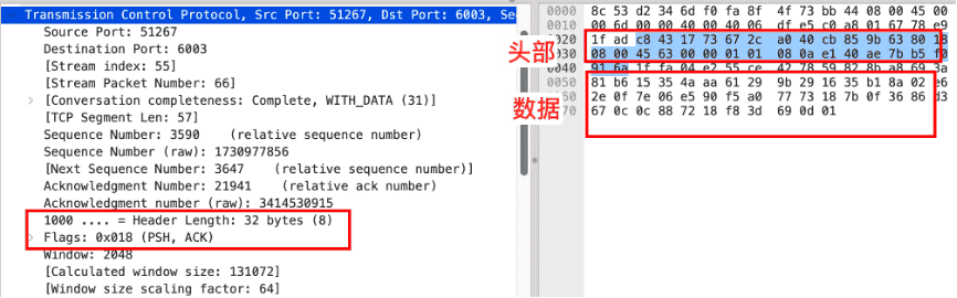 12、1000 …. = Header Length:对应TCP报文的十六进制8,单位为4字节,因此这里表示TCP的头部长度为 (8 × 4) = 32bytes。