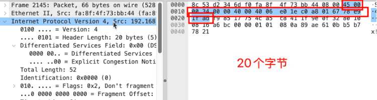 这里的Total Length为52,表示这个IP包一共有52个字节,即前面的20个头部长度(IP层)+ 32个字节的TCP数据。也可以理解为除去以太网层的14个字节的所有字节。