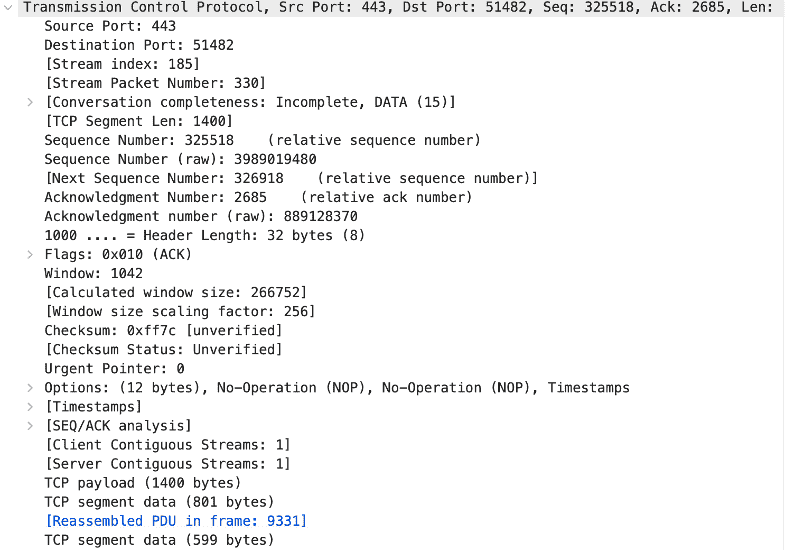 8、Sequence Number (raw):报文携带的32位序号。因为当电脑和服务器建立连接时,第一个数据包的初始序号(ISN)是系统随机生成的,所以没有实际意义。