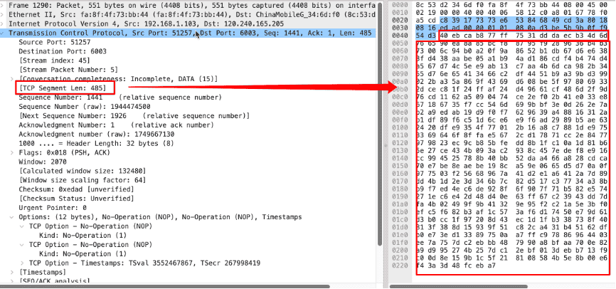 Wireshark数据包结构和十六进制字符相对应,数据结构字段从原始字符中提取,个别字段是由Wireshark整理出来的。
