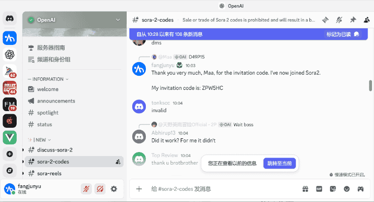 绑定账号完成后,重新进入Discord的OpenAI频道,大部分频道解锁并可以留言。点击进入sora-2-codes频道。