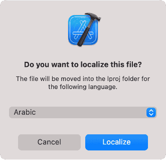 弹出一个提示框,表示你是否要本地化此文件。这里的本地化实际上是移动到对应语言的lproj文件夹中。