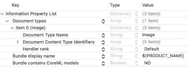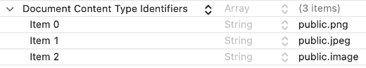 添加打开文件的格式,例如这里配置常见图片格式的UTI类型: