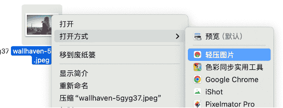 下面以“轻压图片”App为例,右击打开macOS上的图片时,显示“轻压图片”App选项。