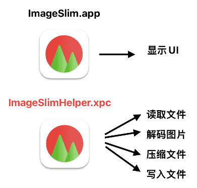 XPC将 App和任务分离,App主要用于显示UI进程,App.xpc 独立运行后台服务进程中,实现读取、解码、压缩以及写入文件等操作。