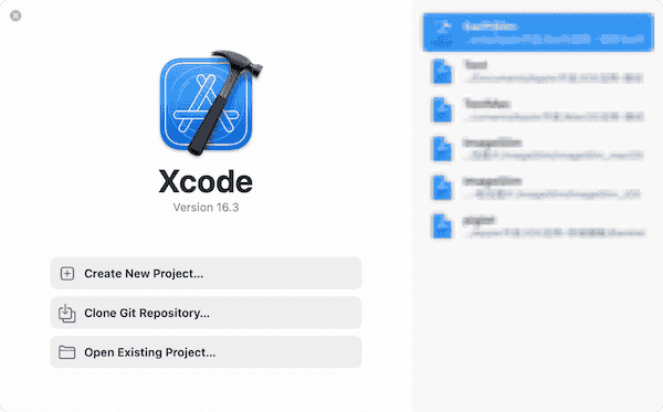 右侧显示最近打开的 Xcode 项目。