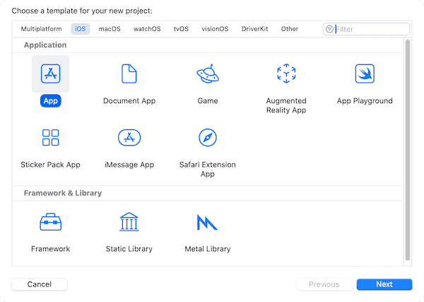在入门阶段,我们只选择 “iOS” – “App” 模板,因为这是界面应用类型。