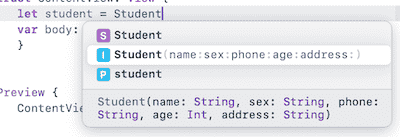 此外,当我们在 Xcode 中输入 `Student(…)` 时,也能看到系统给出的参数提示。